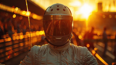 Portrait of a race car driver in full gear at the illuminated circuit, focus on safety and speed