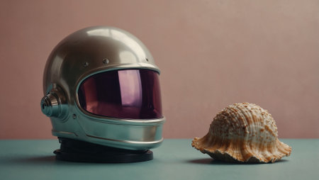 Old space helmet and seashell on pastel background. Minimal abstract evolution and humanity progress concept. Journey from ocean to space idea. Copy space.
