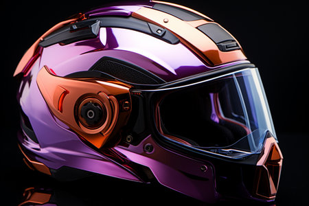 futuristic motorcycle helmet with glowing neon lights. The helmet is isolated on a black background. Generative AI
