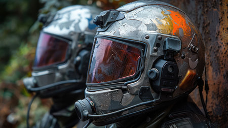A sleek, futuristic helmet features a high-tech visor adorned with glowing red accents, set against a backdrop of a misty forest at twilight, creating a mysterious atmosphere.