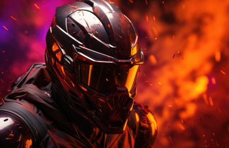 Figure in advanced space like helmet with illuminated visor on dark background, representing future, technology, and adventure