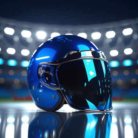 A vibrant blue motorcycle helmet with a dark, tinted visor is showcased in a close-up view. The helmet's polished surface reflects the bright, circular stadium lights that form a blurred bokeh effect in the background. It rests on a glossy surface, mirroring its form. The setting appears to be a sports stadium at night, emphasizing the dynamic and exciting nature of motorsports.