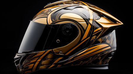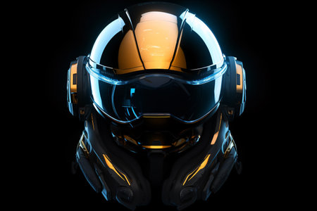 A luminous helmet stands out on a black background. A high quality image making by generative ai.