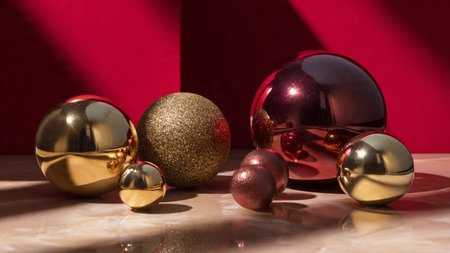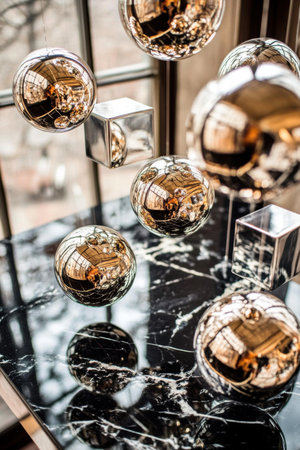 A display of luxurious metallic shapes including gold spheres and silver cubes arranged on a sleek black marble surface showing their reflective qualities in elegant lighting.