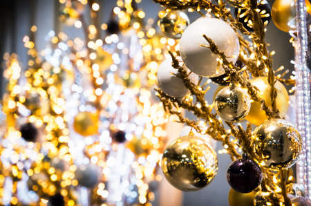 Golden & Silver color of christmas ball on the branches fir with beautiful light bokeh, Decorated Christmas tree. New Year Decoration festive background with vintage tone and selective focus.