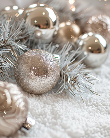 A festive and elegant close-up view of shimmering silver Christmas tree ornaments. The soft bokeh lights in the background add a magical and celebratory atmosphere, perfect for holiday decorations.