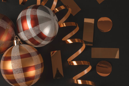 Decorated Christmas tree closeup. Golden, black and silver christmas ornament balls and garland with lights. Winter holiday christmas tree decoration. Christmas greeting card.