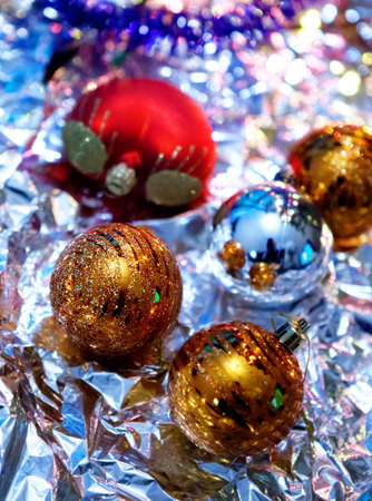 Shiny balloons and colorful tinsel elements of Christmas tree decoration, Close-up, selective focus. New year and christmas