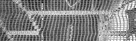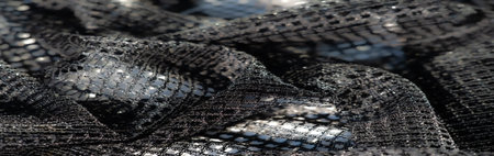 A closeup of the texture and pattern on black mesh fabric, highlighting its gridlike structure with white netting against a dark background. the focus is sharp to capture every detail in high resolution