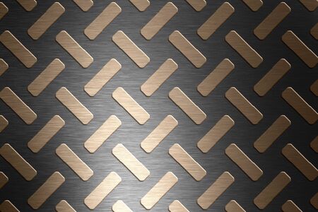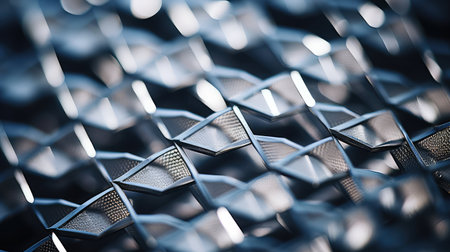 A textured metal surface features a diamond pattern, showcasing reflections and highlights under soft, dim lighting. The design creates an intricate play of light and shadow, emphasizing the material's industrial aesthetic.