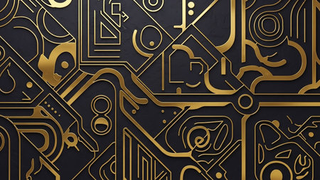 Dark showing title: abstract digital of intricate gold geometric patterns on a dark background. resolution use.