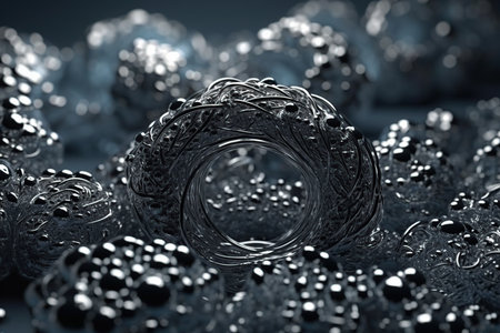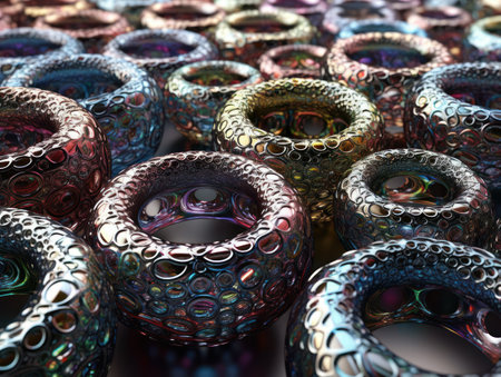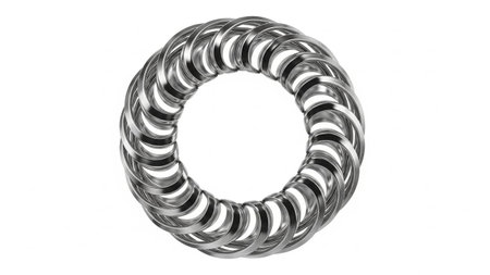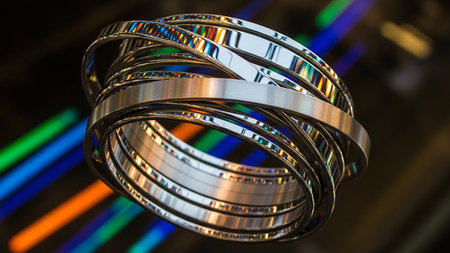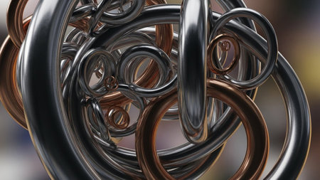 This image features a captivating close-up of shiny metallic rings, creating an intricate and abstract visual composition with dynamic patterns and reflections.