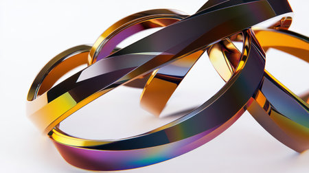 A close-up of metallic rings and tubes, their surfaces reflective with iridescent colors, against an isolated white background. The focus is on the interplay between light and reflection in these metal objects, creating a sense of depth and texture that adds to their futuristic appearance. --chaos 30 --ar 16:9 --v 6.1 Job ID: ee39cc7b-5a1e-4367-ba70-1dff3750321e