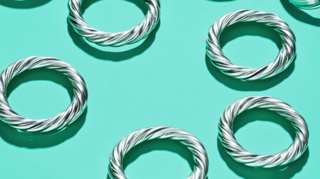 This image features twisted metallic rings arranged on a vibrant turquoise background, creating a striking visual perfect for modern designs and creative applications.