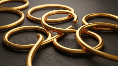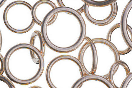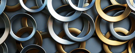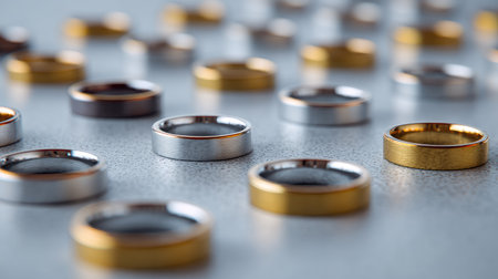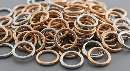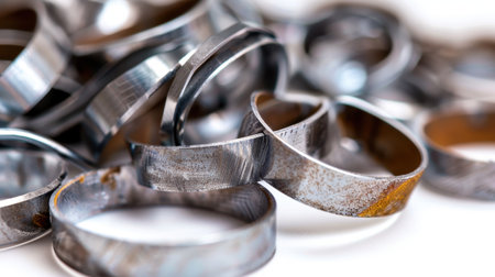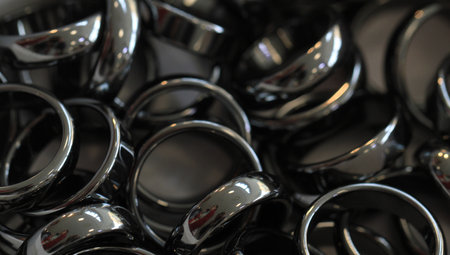 A captivating close-up image of glimmering metal rings and bands, showcasing intricate details, textures, and reflective surfaces. Ideal for industrial, artistic, or design applications.