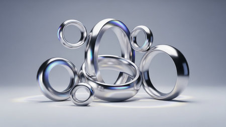 A collection of polished silver rings and toroids are arranged in a dynamic composition against a soft grey gradient...