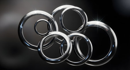 A group of polished, metallic rings of varying sizes are artfully arranged, creating a visually striking abstract arrangement against a dark background.