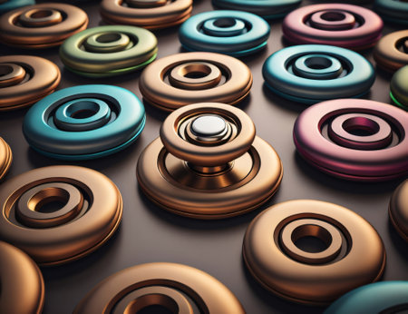 An array of metallic oval rings are presented against a dark backdrop. The objects exhibit a glossy finish, reflecting light and offering a range of colors. The composition is a studio shot focusing on the objects. This image could serve various purposes.