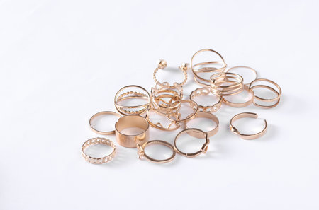 Many Gold rings of different shapes on a white background. Jewelry store, beauty concept