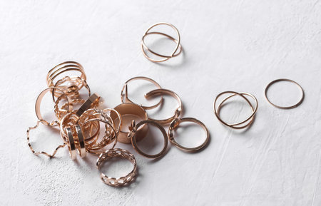 Many Gold rings of different shapes on a white concrete background. Jewelry store, beauty concept