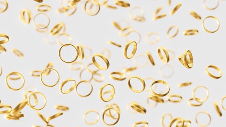 Gold wedding rings floating in an empty light space. This image is a 3d rendering.