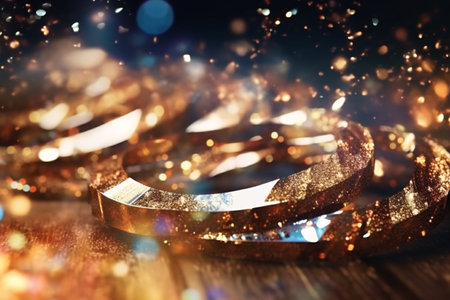 beautiful golden wedding rings on sparkling background