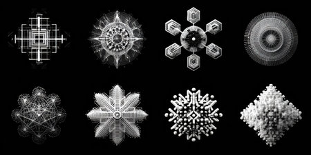 Eight intricate abstract patterns display a range of geometric shapes and forms in black and white on a dark backdrop, illustrating creativity and design.