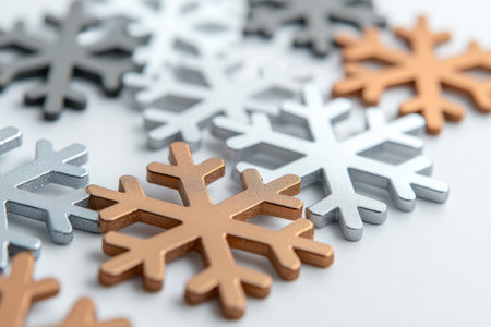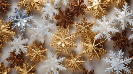 Metallic snowflakes in silver, gold, and bronze create festive atmosphere.