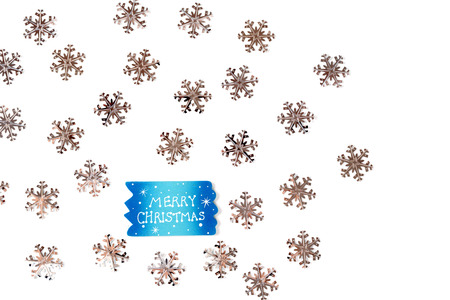 Christmas Background with Silver Little Snowflakes and Sign with Merry Christmas Text over White.