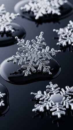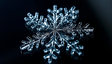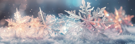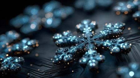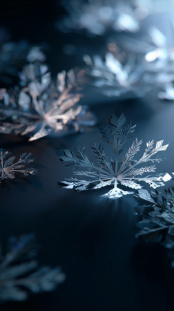 An enchanting closeup image of delicate, intricate snowflakes shimmering beautifully against a rich, dark background, evoking the pure essence of winter and the joyful spirit of the holiday season