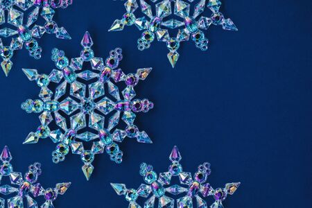 Holographic clear glass snowflakes lying diagonally on trendy dark blue background. Minimal christmas concept. Flat lay style. Color trend 2020 year. Copy space. Open composition.