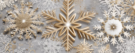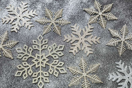 Christmas and New year snowy background. Snowflakes white silver and gold color flat lay. Winter season holidays snowfall,
