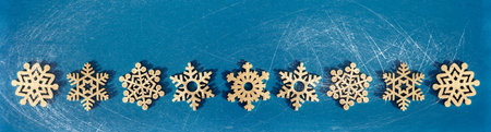 Christmas banner, wooden snowflakes on a blue background. vintage style. copyspace. flat lay. top view.