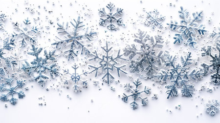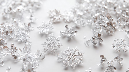 A closeup of sparkling snowflakes scattered on a white background, showcasing their intricate details and crystal-like beauty for seasonal decor or design inspiration.
