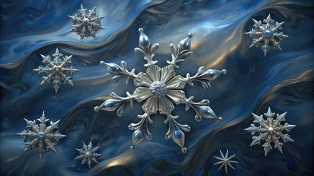 Intricate silver snowflakes on a dark swirling background