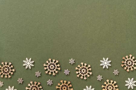 Green Christmas background with wooden ornaments in the form snowflakes, with copy space