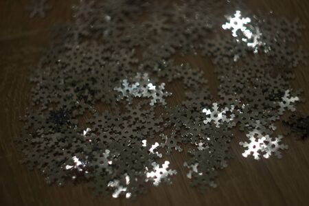 A scattering of silver snowflakes for needlework. Shining snowflakes for decoration of decorative Christmas toys, balls, stars.