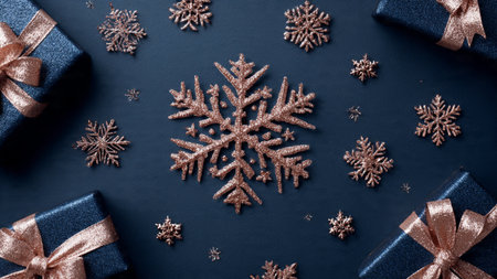 A shimmering rose-gold holiday layout arranged atop a smooth deep-blue background for elegant contrast.