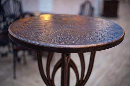 Monolithic table made of metal. Forged furniture for an outdoor cafe. Dining place in the city. Beautiful metal furniture table and chairs. A piece of interior. Steel product.