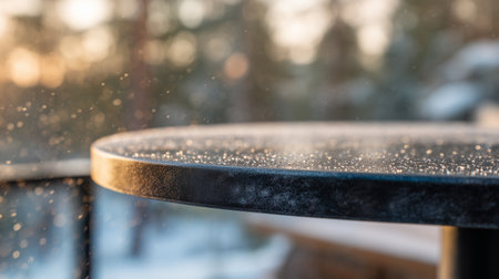 Cold winter morning with steam rising from a metal table in a tranquil outdoor setting