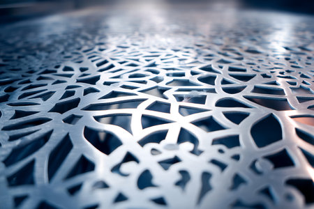 A close-up view of a metallic sheet with detailed laser cut patterns. The design features complex shapes and lines, highlighting precision and craftsmanship.