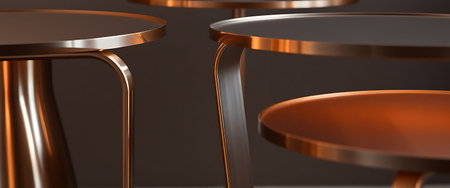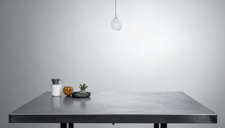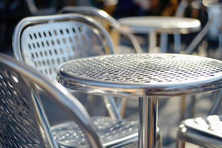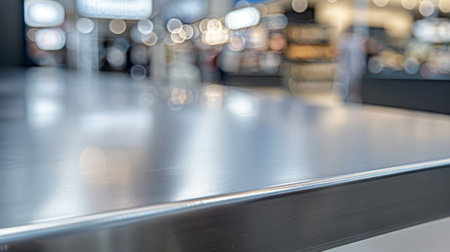 Modern blurred indoor cafe scene with steel tabletop and soft bokeh lighting.