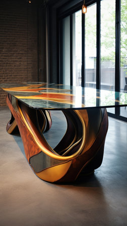 View of a table with a countertop made of old logs and epoxy resin, Generated by AI
