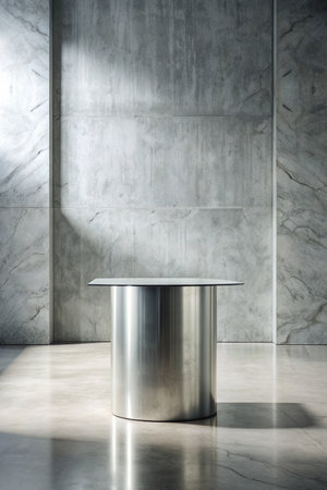 A metallic display stand with brushed metal texture, reflecting soft golden and white light in a clean studio setting.