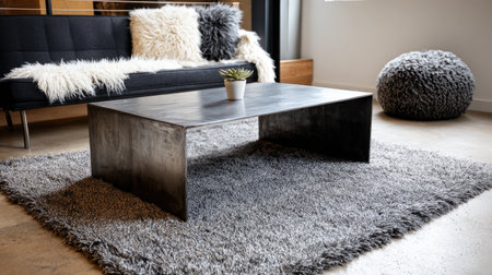This elegant living room features a modern concrete coffee table, complemented by a cozy rug and stylish couch, creating a inviting atmosphere perfect for relaxation and gatherings.
