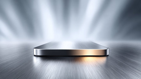 Sleek metallic smartphone lying flat on brushed metal surface with dramatic light rays creating futuristic and elegant atmosphere