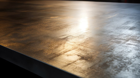 High-angle shot of an empty stainless steel kitchen island table with reflections and natural lighting