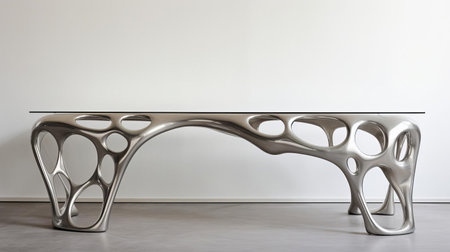 a stunning photograph capturing the elegance of a high-end, large modern fixed organic modular desk. its sleek silver fabric surface reflects effortlessly on the pristine white surface, creating a sophisticated and minimalist aesthetic. ai generated
