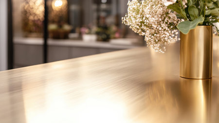A brushed stainless steel surface reflects soft light, creating an elegant backdrop for a gold vase filled with delicate flowers. The modern space is inviting and aesthetically pleasing.