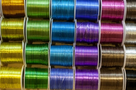 colored spools of wire, placed in the shade on a shelf in the market